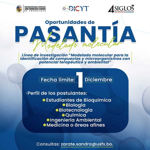 Dirigido a: Estudiantes de la USFX que se encuentren altamente motivados por la investigación científica. Estudiantes de Bioquímica, Biología, Biotecnología, Química, Ingeniería Ambiental, Medicina o áreas afines.